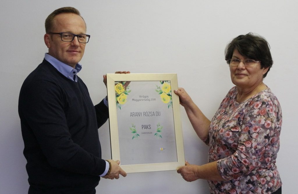 A Virágos Magyarország környezetszépítő verseny egyik legrangosabb elismerését, az Arany Rózsa-díjat nyerte el Paks az idei megméretésen. Ezt a díjat minden esztendőben régiónként egy-egy településnek ítélik oda. Az oklevelet Klézl Terézia, Paks Város főkertésze vette át a Virágos Magyarország verseny idei eredményhirdetésén Nagykőrösön, mellette Szászy Zsolt, a DC Dunakom Városfejlesztési és Szolgáltató Zrt. parkfenntartási részlegének vezetője képviselte városunkat. – Ebben az évben nemcsak a város zöldfelületeit igyekeztünk megmutatni a zsűrinek, és azt a munkát, amit végzünk, hanem arra is igyekeztünk felhívni a figyelmüket, hogy milyen csodálatos természeti környezetben fekszik településünk – mondta Klézl Terézia, hozzátéve, hogy a virágos Sárgödör tér különösen nagy hatással volt a zsűrire. Szabó Péter, Paks polgármestere sajtótájékoztatón mondott köszönetet Klézl Terézia főkertésznek és a DC Dunakom Zrt. munkatársainak, akik nap mint nap sokat tesznek azért, hogy városunk szép, élhető település legyen. Paks korábban már többször is eredményesen szerepelt a környezetszépítő megmérettetésen. 2001-ben a városok kategóriájában első helyezett lett, majd a nemzetközi versenyben ezüstérmet kapott. 2014-ben a Zöldebb Városokért Mozgalom és a Magyar Kertépítők Országos Szövetsége közös különdíját nyerte el, 2015-ben a Földművelésügyi Minisztérium különdíját kapta meg a magyar növény- és virágkultúra megőrzéséért, 2016-ban a Magyar Tájépítészek Szövetsége különdíját, az Acélvirág díjat, tavaly pedig a Magyar Önkormányzati Főkertész Egyesület különdíját. Az idén Paks mellett Polgár, Sándorfalva, Cegléd, Jászfényszaru, Mosonmagyaróvár és Tatabánya kapott Arany Rózsa-díjat. A Virágos Magyarország Környezetszépítő Verseny 2018-as fődíjasa az ezer fő alatti falvak kategóriájában Dozmat lett, az ezer fő feletti falvak kategóriájában Csemő, az ötvenezer fő alatti városok kategóriájában Nagykőrös, az ötvenezer fő feletti városok kategóriájában Szolnok, a budapesti kerületek kategóriában pedig a IV. kerület. Ezek alapján a 25. Virágos Magyarország versenyre nevezett 324 település közül jövőre, az európai megmérettetésen Nagykőrös és Csemő képviseli Magyarországot.