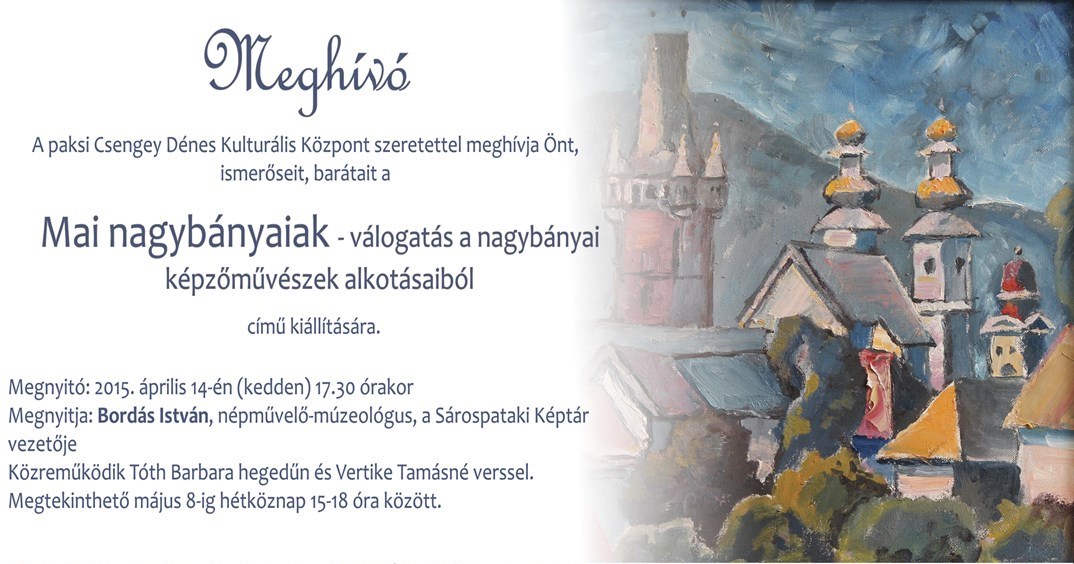 Nagybánya városának neve összefonódik a magyar képzőművészet történetének kimagasló korszakával. A Csengey Dénes Kulturális Központban a mai nagybányai magyar képzőművészek alkotásaiból láthatnak válogatást az érdeklődők április 14-től. A tárlaton hét művész mutatkozik be, akik teljesen másképp látják a világot. Kiállításuk 17.30-kor nyílik, köszöntőt Bordás István, a Sárospataki Képtár vezetője mond, közreműködik Tóth Barbara hegedűn és Vertike Tamásné verssel.