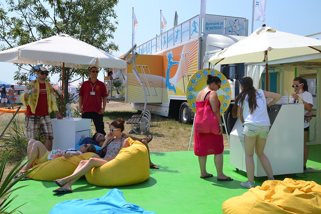 Ahogy a nyár többi nagy fesztiválján, az EFOTT-on is ott volt a Bennünk az energia – interaktív kamion, és rögtön a szomszédságában az Energiasziget. Utóbbin némi szerencsével mobilfeltöltésre, hajszárításra is lehetőség nyílt. A kamionban a szerencse kevés volt, az MVM Paks II. logójával ellátott ajándékokért meg kellett dolgozni. A látogatók a tesztkérdések előtt természetesen tájékozódhattak, akár az interaktív táblák, akár a bemutatkozó társaság fiatal munkatársai segítségével. Csáki Zoltán, a Semmelweis Egyetem hallgatója első EFOTT-ján vett részt. Az itt állomásozó, paksi kapacitás-fenntartást bemutató kamionról ismerősétől hallott, s úgy döntött, tovább bővíti ismereteit. Erre – véleménye szerint – remek eszköz a kamion. Nagy Zoltán Hatvanból utazott Velencére, a fesztiválra. Társaival hosszan időztek az interaktív kiállítótérben végignézve, hallgatva az ismertetőket, sőt a végén a „tanultakat” is tesztelték. Mivel szinte kivétel nélkül helyes választ adott a kérdésekre, a jutalom nem maradt el. A szikrázó napsütésben igazán praktikus ajándék volt a napszemüveg.