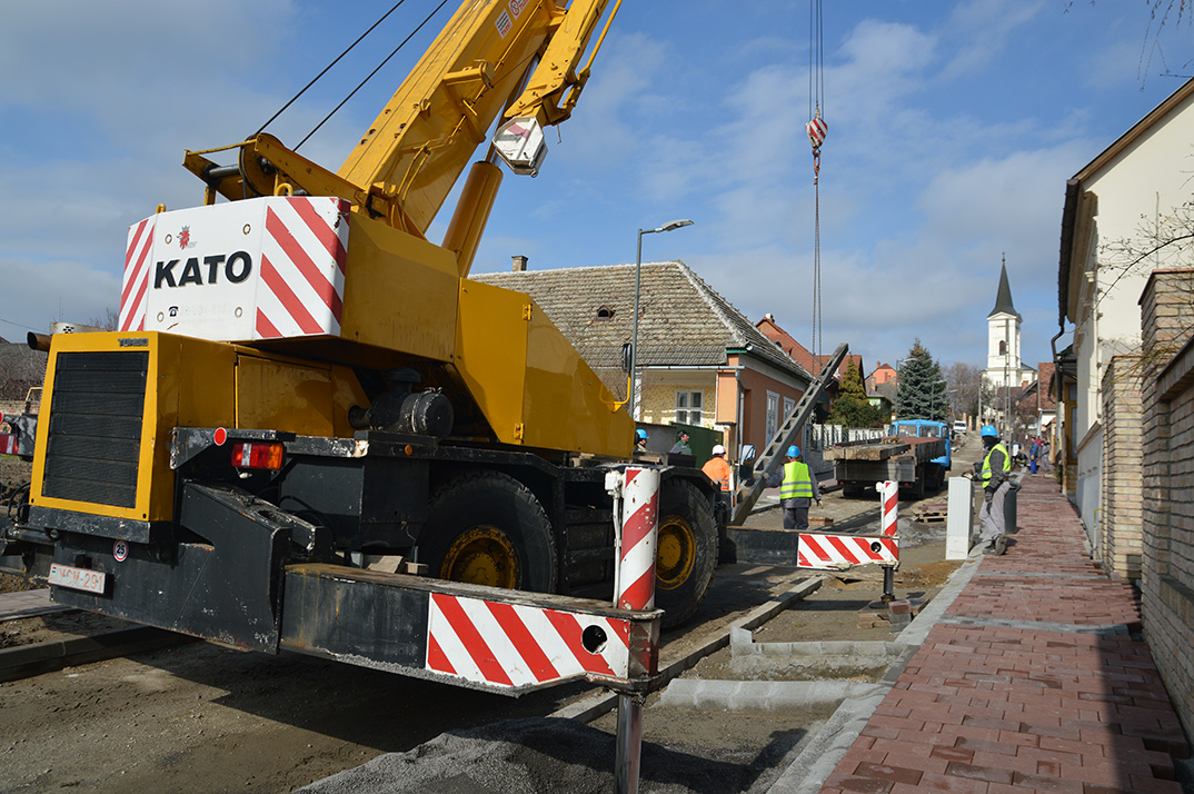 Befejeződött a kábelek föld alá fektetése, most a villanyoszlopok eltávolításával folytatódott a Vörösmarty utca felújítása. A betondúcok kiszedését a DC Dunakom Plusz Kft. alvállalkozójaként dolgozó Pavill Kft. munkatársai végezték el daru segítségével. A közműrendszerek teljes körűen megújultak már az utcában és a járdák térkövezése is befejeződött szinte a teljes szakaszon. A következő lépésben az útburkolat rekonstrukciója zajlik majd, az elkészült betonalapra térkő kerül, az építéssel az óvodától indulnak a Dózsa György út, illetve a Kossuth Lajos utca felé. Az útburkolat-építés idejére a Vörösmarty utcát ismét lezárják a járműforgalom elől, a behajtási tilalomra, melyet táblák jeleznek majd, tervezetten tíz napig kell számítania az ott élőknek és arra közlekedőknek. A felújítás szerződési szerinti befejezési határideje március 31. Addigra a parkosítás is befejeződik – tájékoztatott Puskás János a DC Dunakom Plusz Kft. ügyvezetője.