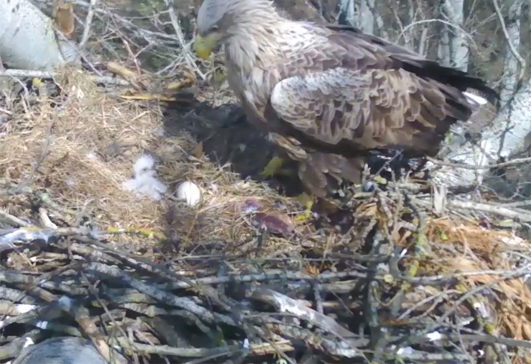 Dombi Imre természetvédelmi őr azt mondta, már péntek este látható volt egy lyuk az egyik tojáson, szombaton hajnalban pedig már eggyel több lakója volt a fészeknek. A szülők naponta öt-hat alkalommal etetik utódjukat, amit az online közvetítésnek köszönhetően akárki megfigyelhet. A hím madár hordja az eledelt a tojónak is, hiszen az a most még igen gyenge fiókát ugyanúgy óvja, melengeti, mint a tojást. Általában az anyaállat eteti a kicsit, de megesik az is, hogy a hím veszi át ezt a feladatot.
