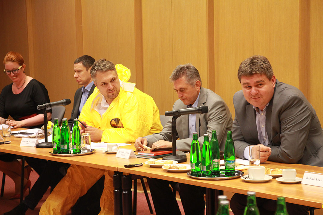 Sallai R. Benedek sugárvédelmi ruhában, maszkban érkezett a paksi kihelyezett ülésre. A bizottság LMP-s elnöke az ülés során sem rejtette véka alá ellenszenvét. Mint mondta, nem a dolgozók szakértelmét kérdőjelezi meg, hanem a technológia létjogosultságát.