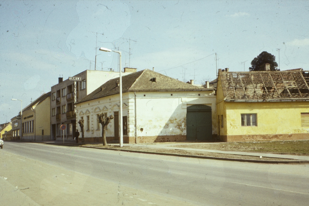Dózsa György út – Duna utca sarok: A főutca frontján közrefogott, középen álló emeletes épület az Állami Biztosító 1971-ben átadott irodaépülete. Az átadáson Lux Sándor igazgató kiemelte, hogy az új fiók öt helyiségének százhatvan négyzetméterén végre kulturált körülmények között tudják fogadni az ügyfeleket. Később, 1989-ben a Dózsa György út és a Duna utca sarkán a városi tanács az OTP-vel közösen huszonkét lakásos társasházat épített a TÁÉV kivitelezésében, amelynek helyén három házat bontottak le még 1979-ben. A kétszintes, tetőtér-beépítéses épület földszintjén üzlethelyiségeket is kialakítottak az 1990-es kulcsrakész átadásra. A képen bontás előtti állapotban – a főutca frontján – a zöld kapus Tannerház látható, mellette a Duna utca északi sarki ház már cserép nélkül várja sorsát.
