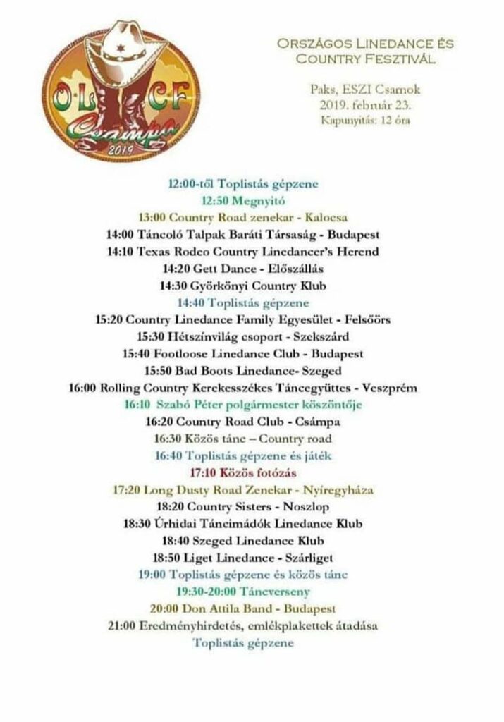 A fesztivál a hazánkban is egyre népszerűbb linedance, azaz vonaltánc szerelmeseinek a seregszemléje. Az együttesek táncbemutatói között koncertek lesznek, illetve táncverseny. A fesztiválra, amelyet 2019. február 23-án rendeznek az Energetikai Szakgimnázium és Kollégium sportcsarnokában, érkeznek tánccsoportok többek között Budapestről, Nyíregyházáról, Györkönyből, Előszállásról és Veszprémből. Bemutatkozik az egyetlen magyar kerekesszékes tánccsoport is, illetve a szervező Csámpai Country Road Club.