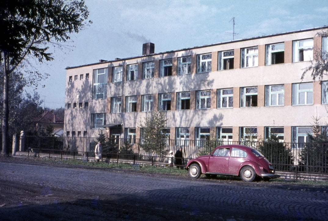 Dózsa György út – Vak Bottyán Gimnázium: Az 1960-as években jelentkező demográfiai hullám, a gyakorlati életre nevelés fontossága a Tolna Megyei Tanácsot arra késztette, hogy Pakson is profilbővítéssel növeljék a középiskolába felvehető tanulók számát. Az Anna utcai kastélyépület nem volt erre alkalmas, új gimnáziumi épületre volt szükség. Paks nagyközség vezetésének a megfelelő területet kellett biztosítani, de ez helyben nagy vitát váltott ki, emiatt majdnem Bátaszékre telepítette a megyei vezetés az új intézményt. Végül a Zsíros köz és a főutca közötti régi labdarúgópályát jelölték ki építési területnek. A Vak Bottyán Gimnázium főépületét a Dózsa György út 103. sz. alatt 1962-ben kezdték felépíteni. A típustervet a Pécsi Tervező Vállalat adaptálta a helyszínre, ahol a szükséges talajfeltöltés elmaradt. Ennek az lett a következménye, hogy egy 1964 nyarán hullott hatalmas zápor eláztatta a területet, és az épület földszinti és kazánházi részét iszap öntötte el. A nyári költözés elmaradt a nagytakarítás miatt, és az Anna utcai korszerűtlen, műemlék jellegű épületből csak a tanévkezdést követően, 1964 késő őszén költözhettek át a mai épületegyüttesbe. Idő kellett a szertárak, tantermek berendezéséhez, a menza üzemeltetésének beindításához és nem utolsósorban megtanulni fűteni a Marabu-4 típusú széntüzelésű kazánokkal. Az 1964/1965-ös tanévben indult negyvenhat tanulóval a kertészeti szakközépiskolai szőlőtermelő és borkezelő osztály is, melynek gyakorlóhelye az állami gazdaság és a borpince lett. A kép bal oldalán látható a névadó Vak Bottyán kurucvezér 1974-ben, az iskola kertjében felállított mellszobra (Tóth Valéria hódmezővásárhelyi szobrászművész alkotása). A főútca még macskaköves volt, és a képen látható egy Volkswagen bogárhátú járgány is, amely a képet készítő dr. Tarján Balázs tanácstitkáré volt.