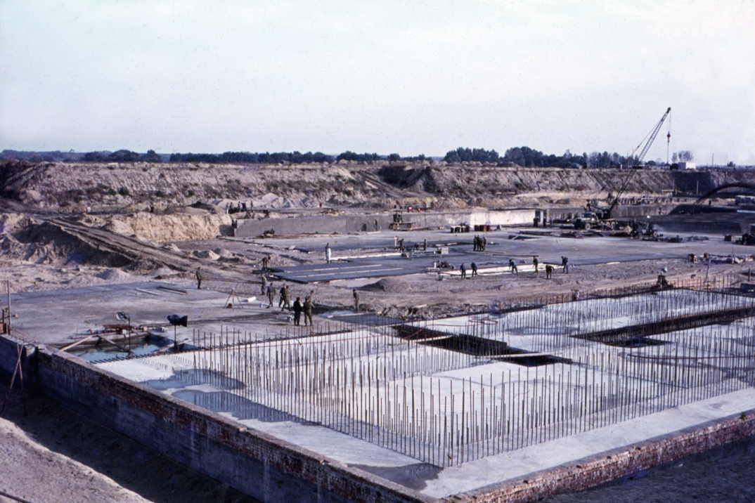 Elérkeztünk a sorozat záródiájához. A dr. Tarján Balázs hagyatékából előkerült diaképek utolsó darabja egy helyszíni munkafotó, hiszen az egész urbanizációs folyamat indukálója az atomerőmű építése volt. 1975- ben az atomerőmű alapozási munkái már javában zajlottak, folytak a betonozások és a vasbetonszerelések. A kép az üzemi főépület, valamint az 1. számú reaktorblokk lokalizációs tornyának aljzatbetonozása, illetve alaplemezének betonozása idején készült. Az óriás, francia Potain-daru még hiányzik a panorámából, mert csak 1976 tavaszán érkezett meg az építkezésre. Viszont már ebben az évben több századnyi honvédségi erő érkezett Paksra, hogy a beruházás munkálataiból katonáink is kivegyék a részüket. 1975. október 3-án ünnepélyesen elhelyezték a paksi atomerőmű alapkövét. Ekkor az előkészítő felvonulási munkák már két éve, az erőmű főépületének építése pedig mintegy fél éve folyamatban voltak. A hagyományoknak megfelelően a rozsdamentes urnába különféle dokumentumok, az alapítólevél, pénzérmék és az aznapi újságok kerültek. A Paksi Atomerőmű Vállalat (PAV) alapítási határozatát a nehézipari miniszter 1975. november 24-én írta alá, ennek értelmében 1976. január 1-jével megalakult a PAV, élére Szabó Benjámin kapott igazgatói kinevezést, akit 1978 novemberétől Pónya József követett a vezetői székben egészen a rendszerváltás utáni időkig.