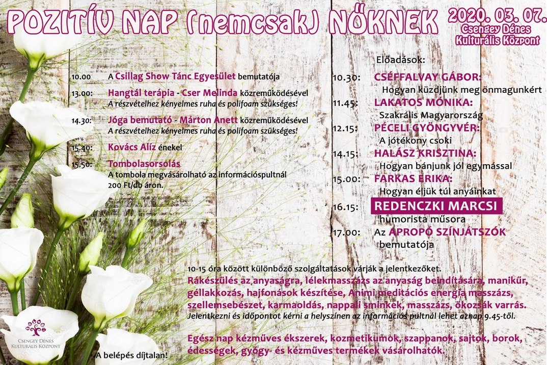 В субботу будет мероприятие Позитивный день в культурном центре им. Ченгеи. Это уже девятый раз, что подобная программа организуется, которая популярная не только среди женщин. В течение дня будут всякие услуги красоты (маникюр, парикмахерская, макияж, гель-лак, массаж), ярмарка, лекции, шоу и лотерея.