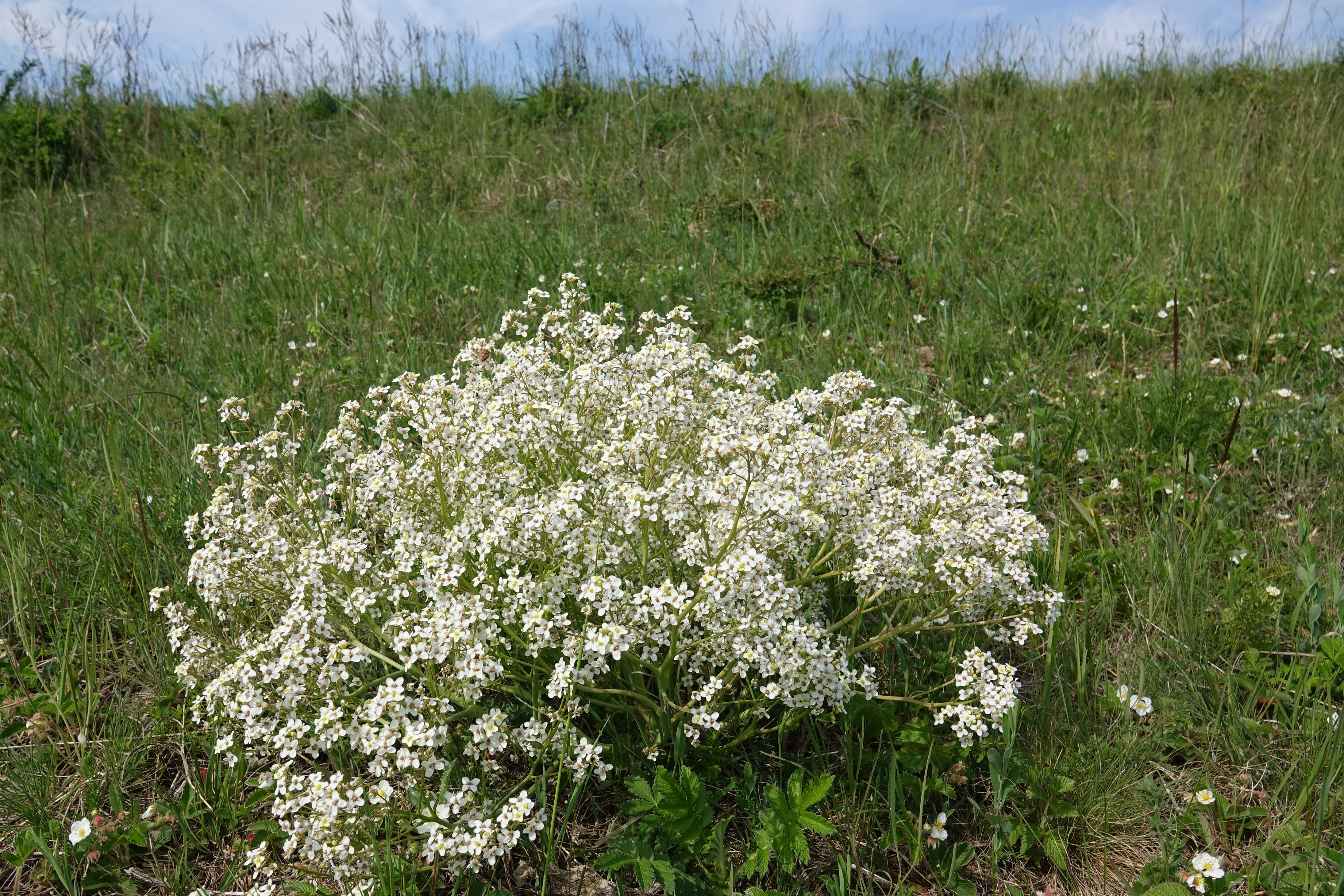 Как мы узнаем катрана татарского? Это — маленькие белые кустики до одного метра. Белые цветы пахнут медом, а стебель пахнет репой. Листья похожи на ладонь. Приятно смотреть на множество маленьких белых ягнят издалека тоже. Растение сейчас цветет: есть белые, цветущие кусты и кустарники с зелеными ягодами. Можно сказать, что катран татарский — растение месяца. Если оно кажется недоступным (по выше сказанным причинам), и в том случае не только целесообразно, но даже обязательно делать пешие или велосипедные походы в окрестностях Пакша. Делмезёфёлд показывает свою самую красивую форму: кроме весенних цветов ковыли качаются на ветру.