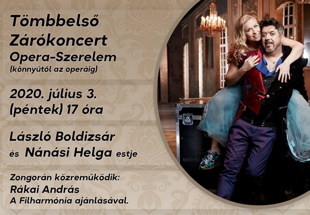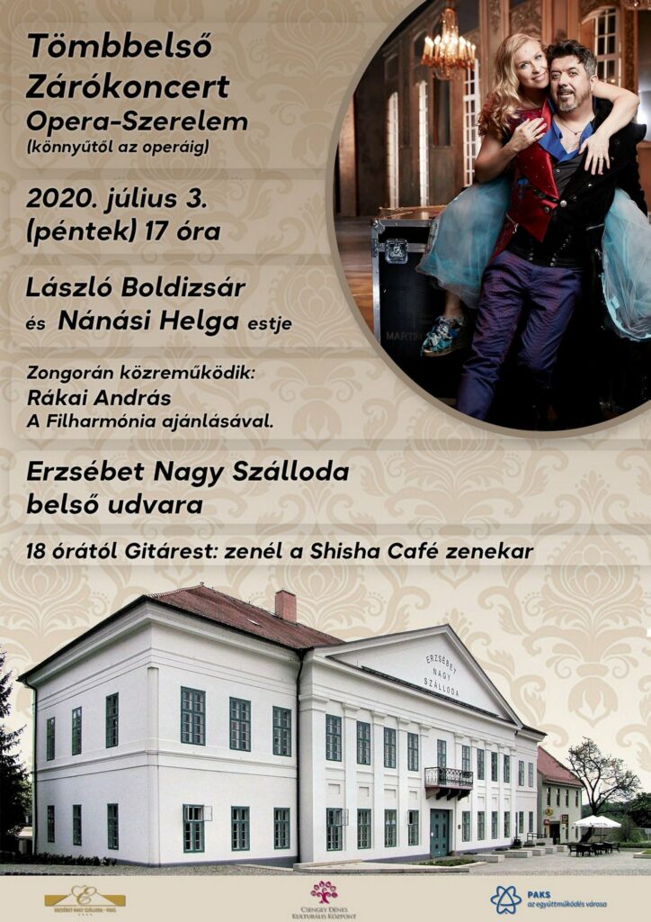 A Tömbbelsőkoncertek hétről hétre elnevezésű programsorozat zárókoncertje lesz 2020. július 3-án az Erzsébet Nagy Szálloda belső udvarán. László Boldizsár és Nánási Helga Opera-szerelem című estje 17 órakor kezdődik, zongorán közreműködik Rákai András. Ezt követően, 18 órától, a Shisha Café zenél. Várják az érdeklődőket a szálló udvarára, de az előadást a TelePaks televízió ez alkalommal is élőben közvetíti 17 órától a Paksi Hírnök – TelePaks Facebook-oldalon. A programsorozatot az önkormányzat kezdeményezésére a Csengey Dénes Kulturális Központ szervezte.