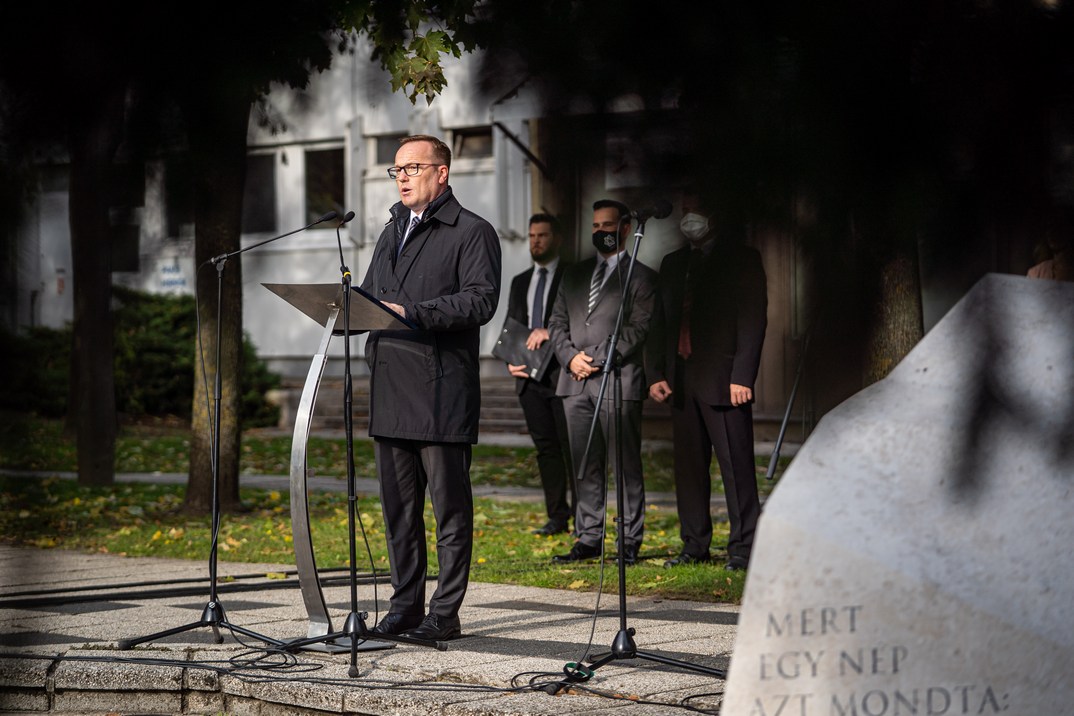 Beszélt arról, hogy a sztálini eszmékre épülő Rákosi-rendszer legnagyobb bűne nem is az ország elszegényítése volt. – Az akkori kommunista rendszer legnagyobb bűne az ember szabadságának, méltóságának és egy reményteljes, gyarapodó élet lehetőségének elrablása volt. A népi demokrácia nevében bizonytalanságba, rettegésbe, egzisztenciális és lelki félelembe taszították a magyar embereket. Az ötéves tervekkel, munkaversenyekkel, hazug földi paradicsomot ígérő ideológiájukkal becsapták, tönkretették hazájukat és a magyar embereket. 1956 kommunista vezetői a romlás, erőszak, pusztítás és a hazugság nyomait hagyták nemzetünk történelmében – mondta a polgármester, majd feltette a kérdést: És mit kapott nemzetünk mindörökre ’56 hőseitől, mártírjaitól?