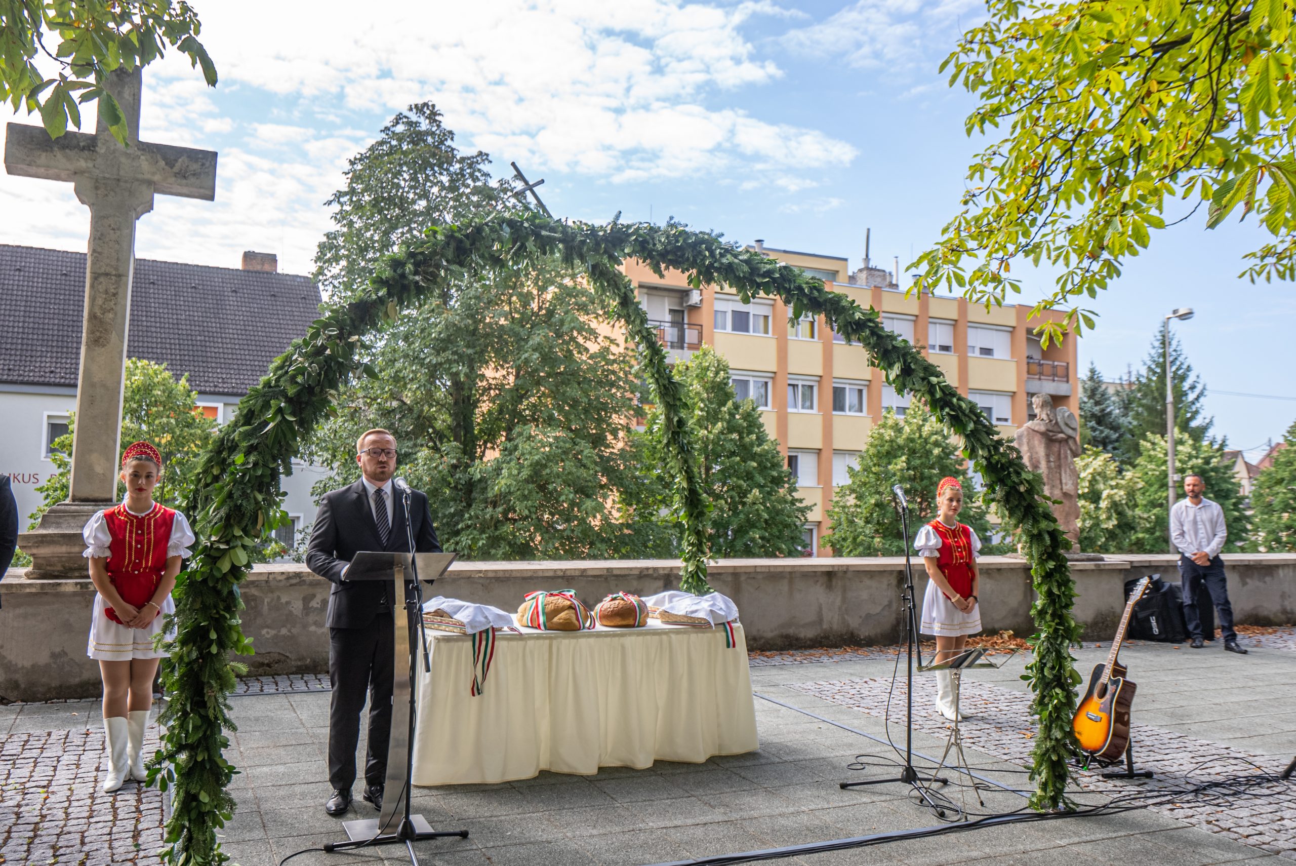 A városi ünnepségen Zuschlag-Nepp Éva evangélikus lelkész, Lenkey István református lelkész és Kutas Attila római katolikus plébános (a fotón b.-j.) mondták el ünnepi gondolataikat, és megszentelték az új kenyeret, amelyből a megemlékezés végén – a hagyományt követve – megkínálták a jelenlevőket. Az ünnepségen közreműködött Szabó Dávid (gitár, ének). A bazársor tetején megtartott megemlékezés előtt ünnepi szentmise volt a Jézus Szíve templomban.