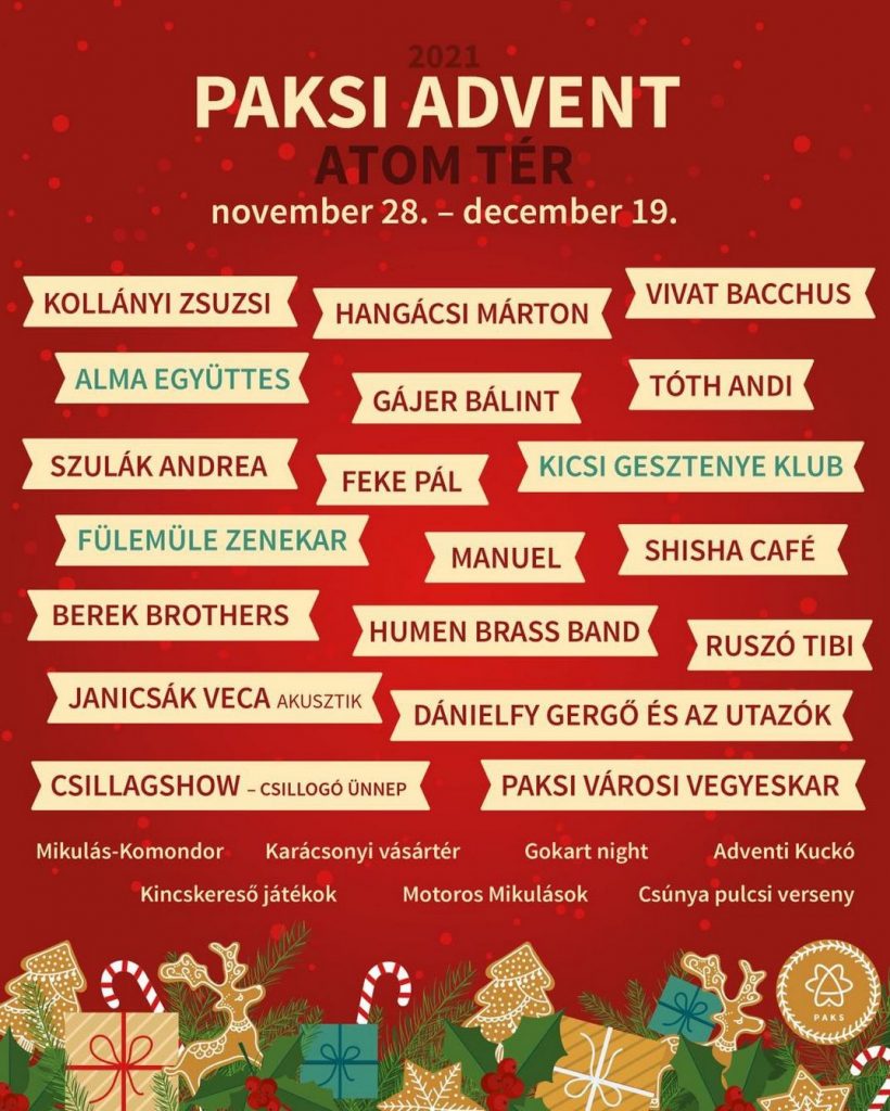 – Minden feltétel adott ahhoz a megújult Atom téren, hogy a Paksi Advent rendezvényt idén itt tartsuk meg – jelentette be sajtótájékoztatón Szabó Péter polgármester november 16-án. A Paksi Advent programsorozat november 28-án kezdődik, és december 19-ig tart. Erre az időszakra faházakkal települnek ki a térre helyi kereskedők, kézművesek. A gasztronómiai élmények mellett kulturális kavalkáddal várják a szervezők a lakosságot. A sztárfellépők között Janicsák Veca, Tóth Andi, Feke Pál és Ruszó Tibi neve is szerepel, de fellépnek paksi és környékbeli zenekarok is, mások mellett a Shisha Café, a Berek Brothers, valamint színpadra áll a Paksi Városi Vegyeskar, és műsort ad a Csillag Show Táncegyesület is. A kicsiknek gyermekprogramokkal készülnek a szervezők. Márkus Zalán, a kulturális központ ügyvezető igazgatója az idősebbeknek szóló programokról, mint például a Volt egyszer egy Táncdalfesztivál című koncertről, workshopokról tájékoztatott, és bejelentette azt is, hogy a jelenlegi jogszabályok értelmében a Paksi Advent rendezvényei védettségi igazolvány nélkül látogathatók. A részletekről a kulturális központ online felületein, valamint a programfüzetből tájékozódhatnak, amit minden háztartásba eljuttatnak.