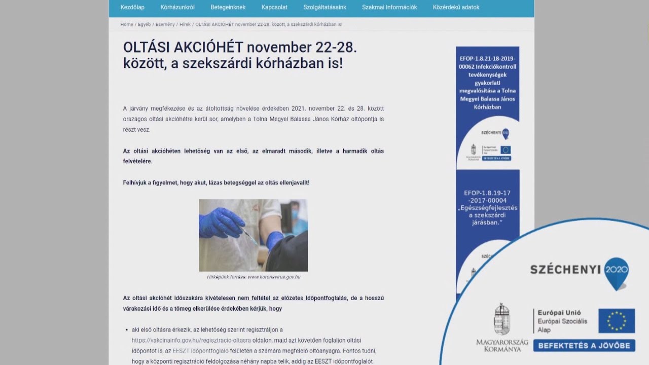 Zajlik az oltási akcióhét november 22. és november 28. között országszerte. A héten így előzetes regisztráció és időpontfoglalás nélkül lehet felvenni első, a második vagy a harmadik koronavírus elleni védőoltást. Hétfőn országosan megközelítőleg 131 ezer vakcinát adtak be. Tolna megyében Bonyhádon, Dombóváron és Szekszárdon lehet oltakozni. Németh Csaba a Tolna Megyei Balassa János kórház főigazgatója azt mondja: nagy az érdeklődés, a szekszárdi Balassa János Kórház oltópontjain hétfőn mintegy 1100 vakcinát adtak be a jelentkezőknek.