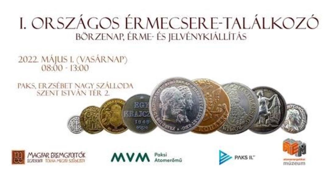 Érmecsere-találkozóra, börzére és kiállításra várják a numizmatika iránt érdeklődőket Pakson, az Erzsébet Nagy Szállodába május 1-jén 8 és 13 óra között. Az MVM Paksi Atomerőmű Zrt., a Paks II. Zrt., az Atomenergetikai Múzeum, az Első Magyar Jelvénymúzeum és a Magyar Éremgyűjtők Egyesülete Tolna megyei Szervezete együtt rendezik meg az első paksi érmecsere találkozót és börzenapot, mely esemény keretében az erőmű saját éremgyűjteményébe is betekintést nyerhetnek az érdeklődők kiállításon. A rendezvényen az Atomenergetikai Múzeum mutatja be azokat az érméket agyűjteményéből, amelyek a Paksi Atomerőmű mérföldköveinek megünneplése alkalmából készültek, limitált számban. A szervezésben jelentős szerepet vállalt Lenkei István, a Paks II. Zrt. vezérigazgatója, lévén maga is éremgyűjtő. Jelvények is megtekinthetők, vásárolhatók, csereberélhetők lesznek, hiszen a közelben – Bogyiszlón – található az ország első, és eddig egyetlen jelvénymúzeuma. Az alapító, Király József, aki jelvényeket és érmeket is gyűjt, szintén részt vesz a paksi találkozó megszervezésében. A belépés ingyenes lesz, csak akik árusokként érkeznek, azoknak kell fizetniük a standokért (asztalokért). Az asztalt igénylő gyűjtőtársak 7.30 és 8 óra között foglalhatják el helyüket.