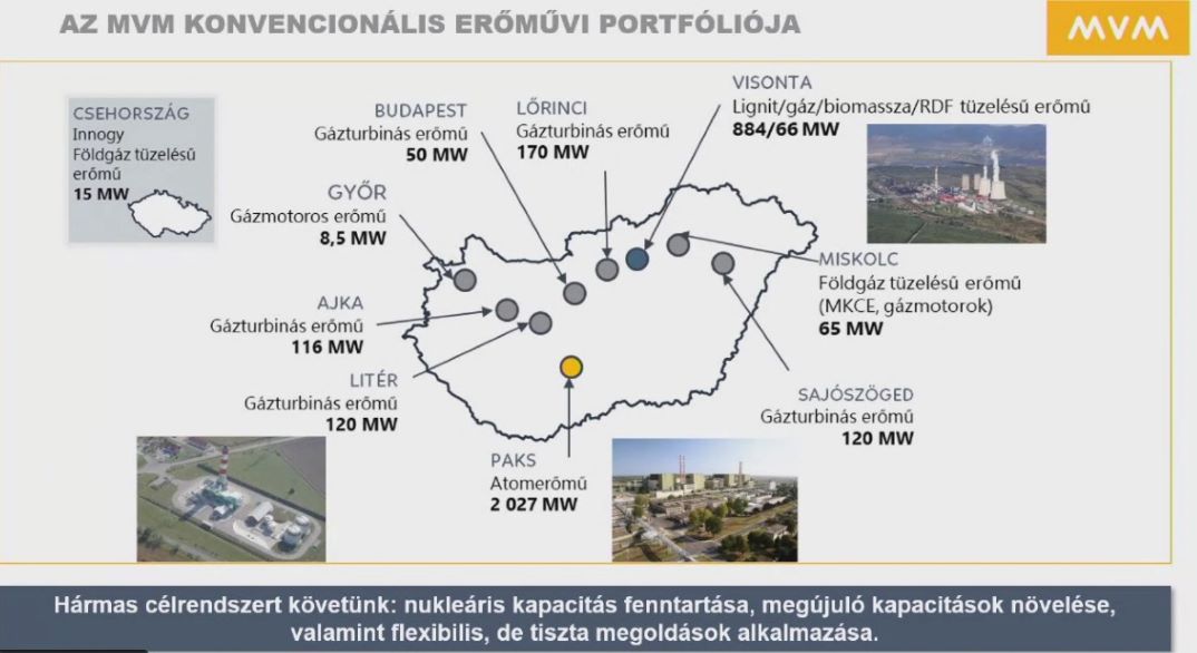 A novekedes.hu összefoglalója szerint Kiss Csaba kifejtette, hogy öt éve csak egyetlen naperőműteleppel bírt az MVM, ma 160-nal rendelkeznek, és még az idén további 33-mal nőhet ez a szám. Óriás fejlesztések zajlanak a Mátrai Erőműben. A lignittüzelésű blokkok 2029-ig maradhatnak, ezzel párhuzamosan azonban naperőművek, hidrogéntechnológia és egy új szemétégető is kiépülhetnek. Fejlesztik a Tiszai Erőművet is. Elmondta, hogy a jövőben az energiafogyasztás jelentős része a villamos energiára tevődik át. Ezen belül az energiatermelési portfólióban a nukleáris energia megmarad, a paksi atomerőmű üzemidő meghosszabbítása is segíti a jövő energiabiztonságát, sőt Paks II üzembelépésével a nukleáris termelőkapacitások megduplázódnak. Tájékoztatása szerint ezen felül mind a szél, mind a napenergia szerepe tovább növekszik. – Jelentős napelemes (PV) kapacitás mellett a folyamatos ellátás csak akkor megvalósítható, ha foglalkozunk egyéb kapacitásokkal is. Ennek érdekében vizsgálni kell a hidrogéntechnológiákat is – tette hozzá, kiemelve, hogy a hidrogéntechnológia nem egy termelési mód, hanem egy energiaszállítási eszköz. Ráadásul a hidrogéntechnológiák gyors terjedése csak 2030 után várható. Szavai szerint jelenleg a földgáz alapú erőművek a legalkalmasabbak a kiegyenlítő szerepre. Rövidtávon – középtávon gázturbinák nélkül nem lehet az energiarendszer egyensúlyát fenntartani. Kiss Csaba fontos lépésnek nevezte Paks I üzemidő hosszabbítását. Hangsúlyozta, hogy a nemzetközi trendeknek megfelelően a nukleáris erőművek üzemidő hosszabbításáról döntöttek. Napjainkban már a 60-70, sőt 80 éves üzemidejűre hosszabbított erőmű sem ritka a világon – mutatott rá. Így további 20 évre tudnak jelentős nukleáris kapacitást megtartani. Az MVM számos egyéb erőműfejlesztésben érdekelt, illetve folyamatban lévő energiatároló projektekben. Jelenleg két akkumulátoros tárolókapacitás kiépítésén dolgoznak.