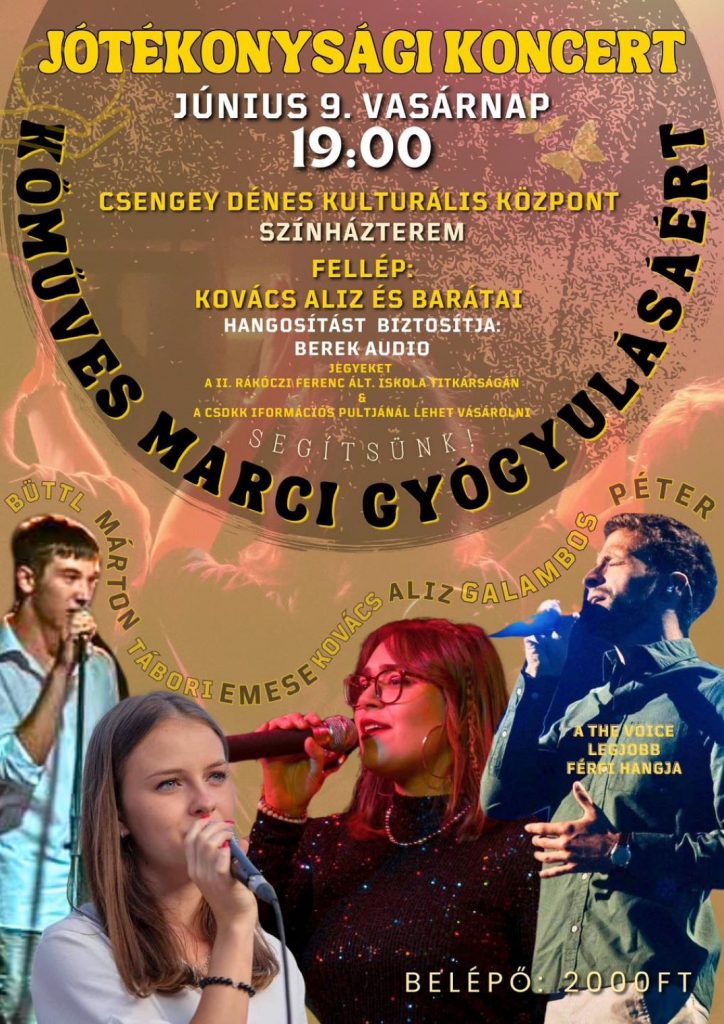 A jótékonysági koncerten, ami június 9-én 19 órakor lesz a Csengey Dénes Kulturális Központban, fellépnek Kovács Aliz és barátai, a tavalyi év legjobb férfi hangja, Galambos Péter, aki hatalmas szívével ragadja meg az emberek lelkét, Tábori Emese angyali hangjával simogatja a szíveket, Büttl Márton arany hangjában ott van a múlt, jelen és jövő is egyszerre. Hangszeren kíséri őket Berek Dániel, Feil Dániel, Ludányi Miklós és Mozbacher Zoltán, valamint közreműködik az értékekkel fűszerezett, fantasztikus Duna Grund is. A hangosítást a Berek Audio biztosítja.