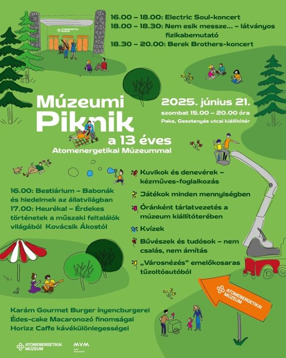 Ha június, akkor Múzeumi Piknik! Abból is immár a negyediket szervezi meg az Atomenergetikai Múzeum (AEM) 2025. június 21-én a Gesztenyés úti kiállítóterénél. Mivel a múzeum 2025. március 6-án ünnepelte megnyitásának 13. évfordulóját, így a rendezvény tematikáját is a 13-as szám adja, egészen pontosan a tudományos tévhitek és babonák. Vincze Bálint természetfotós színes képekkel illusztrált előadása az állatvilágban fellelhető babonákról 16 órakor kezdődik. Heuréka címmel Kovácsik Ákos a HUN-REN Energiatudományi Kutatóközpont képviseletében 17 órától érdekes történeteket hoz a műszaki feltalálók világából. Látványos fizikabemutató keretében Krizsán Árpád, a múzeum munkatársa és Härtlein Károly, a Műegyetem mesteroktatója látványos kísérletekkel cáfolnak meg fizikai jelenségekkel kapcsolatos félreértéseket 18 órakor. A jókedv és a vidámság beköltözik a kiállítótér udvarára 15 órától. Kézműves-foglalkozások, kvízek, mászófal, cirkuszi sátor és a szörfszimulátor mellett lesz lehetőség városnézésre egy emelőkosaras tűzoltóautóból egészen 20 óráig. Óránként indul tárlatvezetés a kiállítótérben, ahol az érdeklődők a paksi atomerőmű működéséről, az atomenergetika múltjáról, jelenéről és jövőjéről is átfogó képet kapnak – a témát övező, a köztudatban élő tévhiteket tudományos tényekkel megcáfolva. A sokszínű programok mellett a Karám Burger ínyencburgerei, az ÉdesCake Macaronozó finomságai és a Horizz Caffe kávékülönlegességei is várják a látogatókat. Mindezeket pedig kellemes zene, 16 órától az Electric Soul, majd 18.30-tól a Berek Brothers koncertje koronázza meg. A részletes program a múzeum honlapján (muzeum.atomeromu.hu), valamint közösségi média oldalán tekinthető meg.
