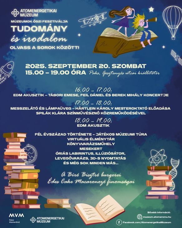 Tudomány és irodalom – Olvass a sorok között! címmel rendeznek programot a múzeumok őszi fesztiváljához kapcsolódva az Atomenergetikai Múzeumban szeptember 20-án. Az érdeklődőket 15 és 19 óra között várják a Gesztenyés úti kiállítótérbe változatos programmal. Lesznek koncertek, előadás, játékos múzeumi túra, mesekert, labirintus, illúziósátor és még sok minden más: