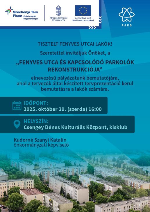 Kudorné Szanyi Katalin az ötös számú választókerület önkormányzati képviselője (PDF) lakossági fórumra hívja a Fenyves utca lakóit a Fenyves utca és kapcsolódó parkolók rekonstrukciója elnevezésű pályázat bemutatójára, ahol a tervezők által készített tervprezentációt mutatják be. A fórum október 29-én 16 órakor lesz a Csengey Dénes Kulturális Központ kisklubjában.