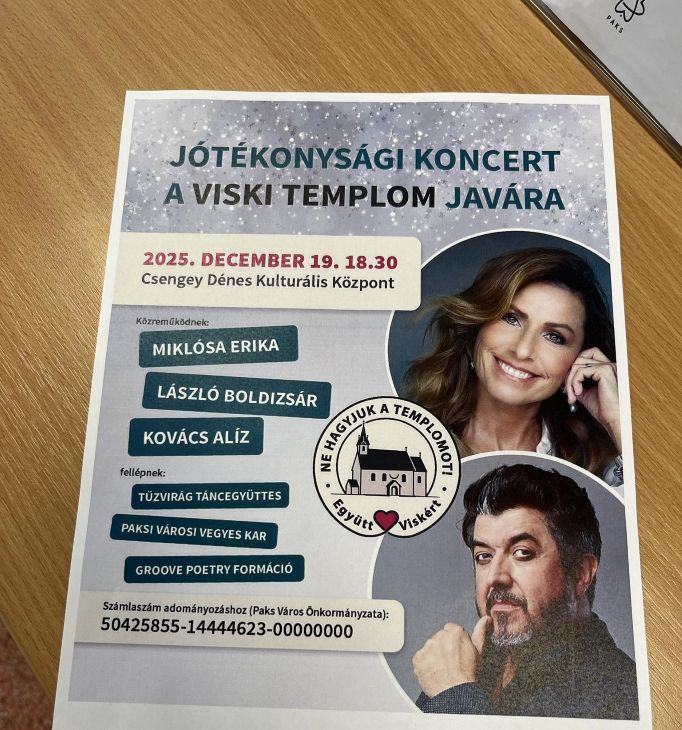 A sajtótájékoztatón azt is elmondták, hogy egy jótékonysági koncert is lesz, mégpedig december 19-én a Csengey Dénes Kulturális Központban, ahol fellép Miklósa Erika, László Boldizsár, Kovács Aliz, a Paksi Városi Vegyes Kar, a Tűzvirág Táncegyüttes és a Groove Poetry elnevezésű formáció. A koncertre már válthatók jegyek 3, 6 vagy 15 ezer forintért. Az esten befolyt teljes bevételt az adománygyűjtő számlára utalja a kulturális központ.