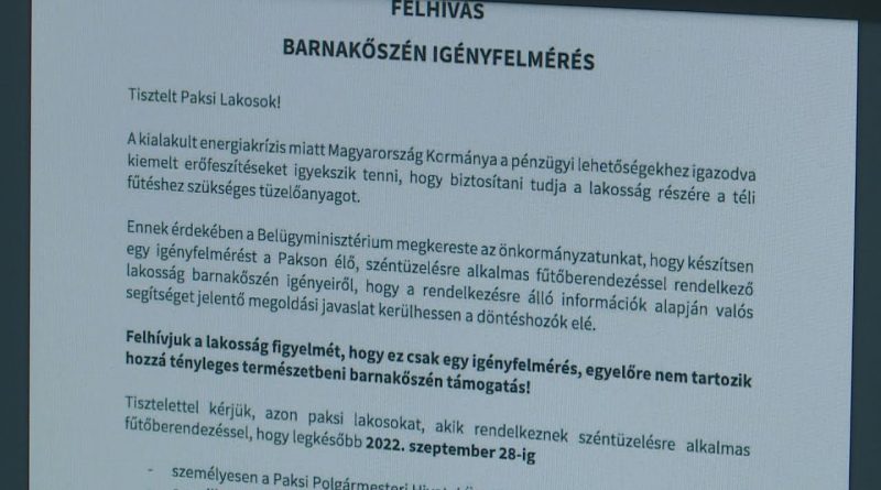 Barnakőszén igényre végez lakossági felmérést Paks Város Önkormányzata. Az űrlap elérhető a www.paks.hu oldalon illetve a Városháza ügyfélszolgálatán. A dokumentumokat legkésőbb 2022. szeptember 28-ig lehet elküldeni a pm.titkarsag@paks.hu email címre, illetve személyesen is leadható a Paksi Polgármesteri Hivatal ügyfélszolgálatán.